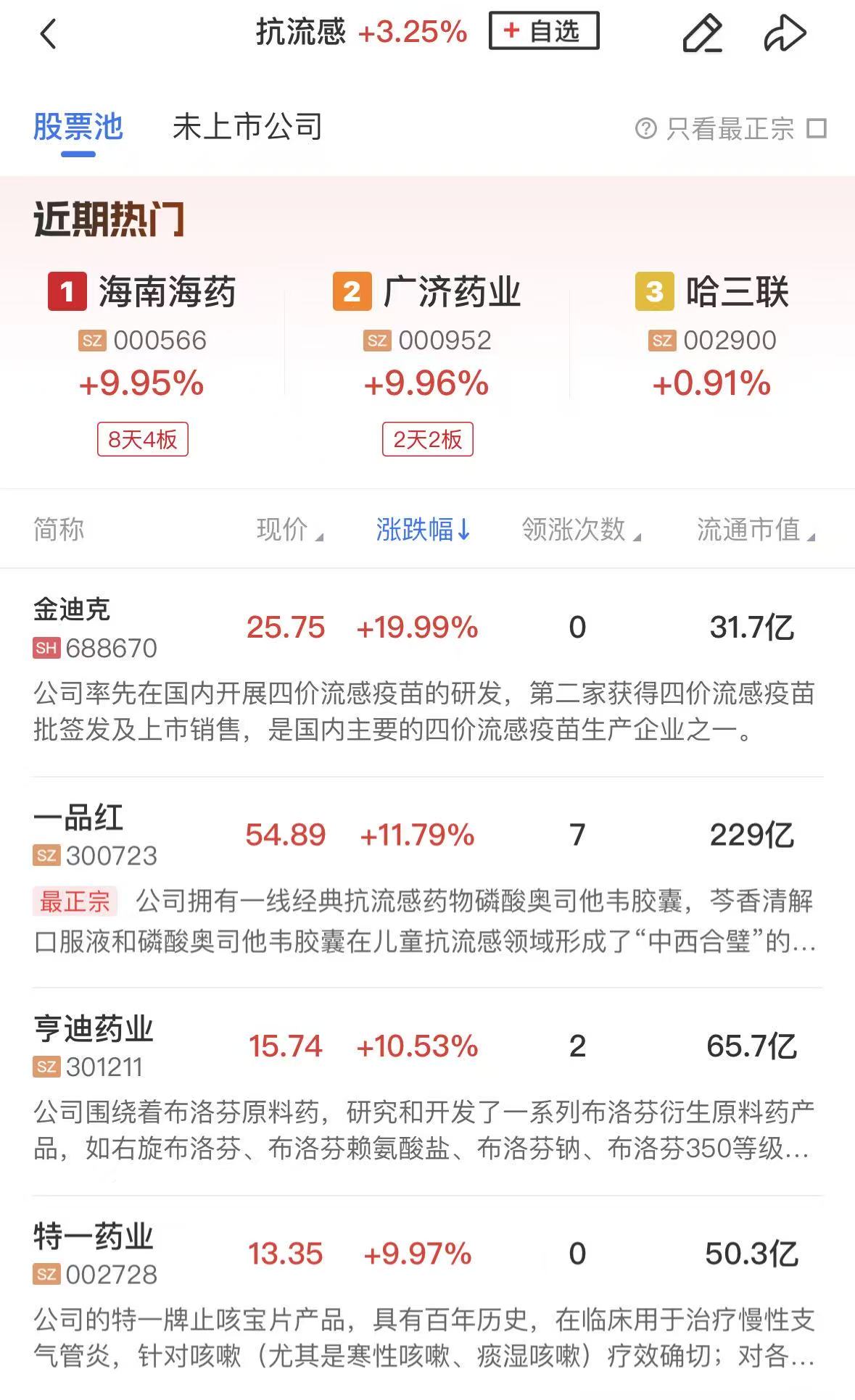 抗流感概念表现活跃,广济药业2连板,金迪克、特一药业、北大医药、海南海药涨停,一品红、华兰疫苗、金石亚药、众生药业等个股涨幅居前。