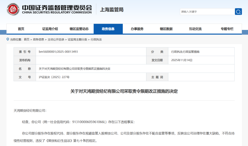近日,上海证监局披露一则关于对天鸿期货采取责令限期改正措施的决定。该罚单中提到,天鸿期货存在多项违规事实,包括股权代持、部分股东存在规避监管入股期货公司、公司及部分股东存在不配合监管等违规行为,责令3个月之内改正。