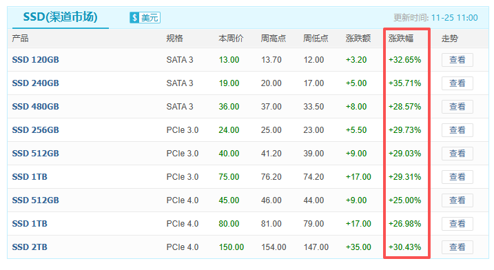 财联社11月25日讯,存储市场涨价还在继续。据CFM闪存市场最新数据,截至11月25日中午11时,渠道市场数据显示,固态硬盘SSD近一周涨价明显,其中,SSD 240GB、SSD 120GB、SSD 2TB三类产品价格周涨幅分别达到35.71%、32.65%、30.43%,其他SSD产品价格周涨幅也均在25%及以上。