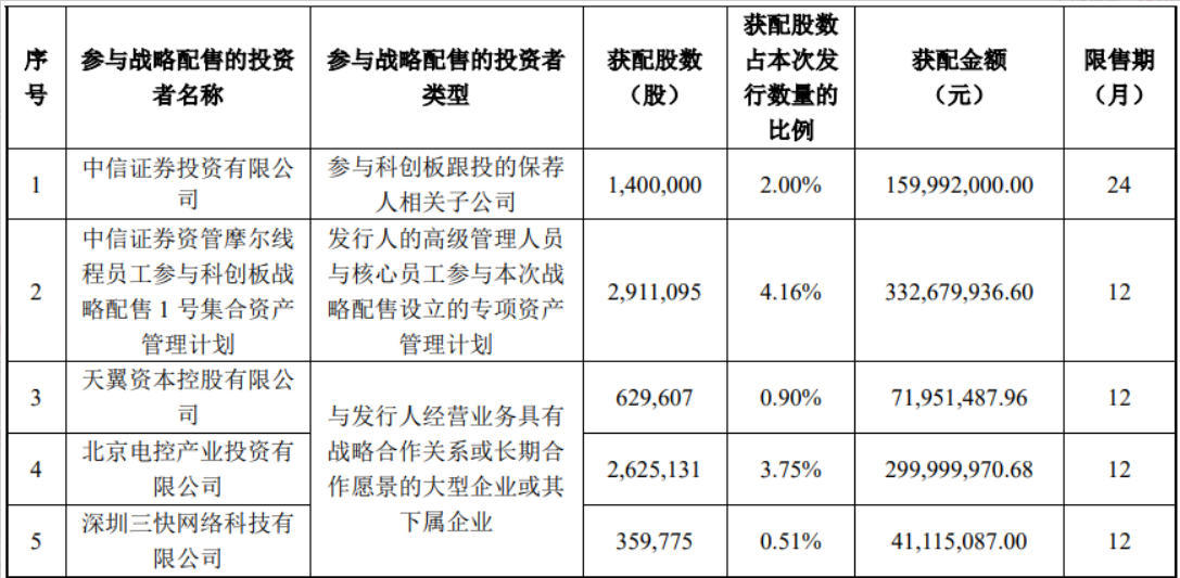 财联社11月25日讯,摩尔线程发布首次公开发行股票并在科创板上市网下初步配售结果及网上中签结果公告,本次发行战略配售的缴款及配售工作已结束,本次发行的参与战略配售的投资者均按承诺参与了本次发行的战略配售。经确认,《发行公告》中披露参与战略配售的投资者参与本次发行的战略配售有效。本次发行最终战略配售结果如下。中签结果如下: