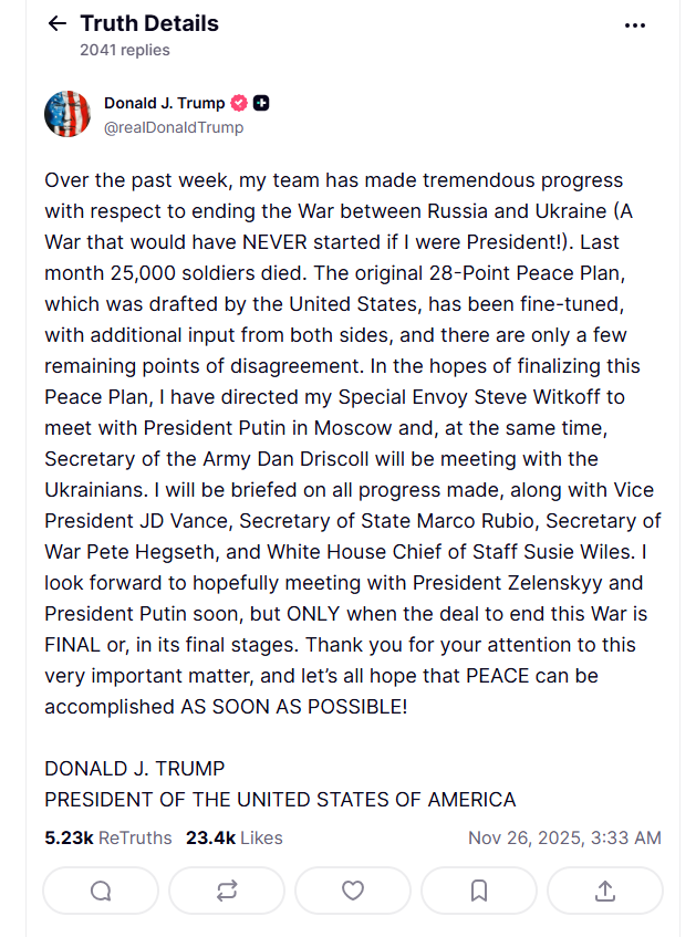 周二下午晚些时候,特朗普在其社交平台“真实社交”(Truth Social)上发帖表示,美方起草的28点新计划已经“微调”,“只剩下几个分歧点了。”