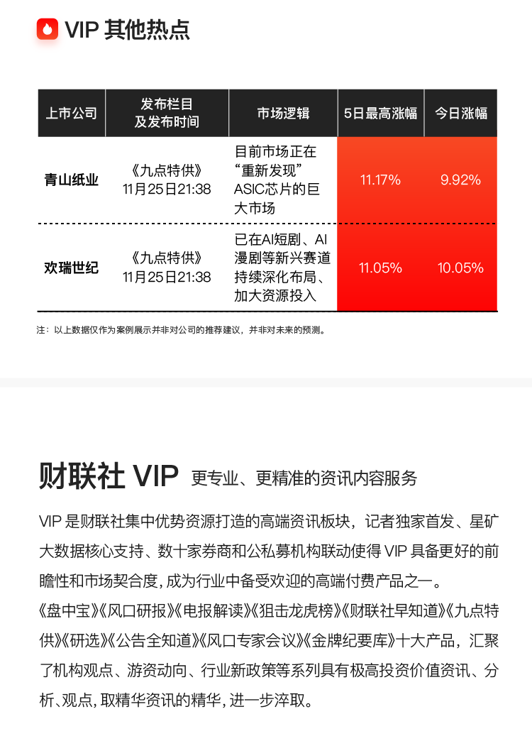 注:财联社VIP为内容资讯产品,并非投资建议。以下内容仅为资讯价值展示非对相关公司的推荐建议,非未来走势预测。投资有风险,入市需谨慎。