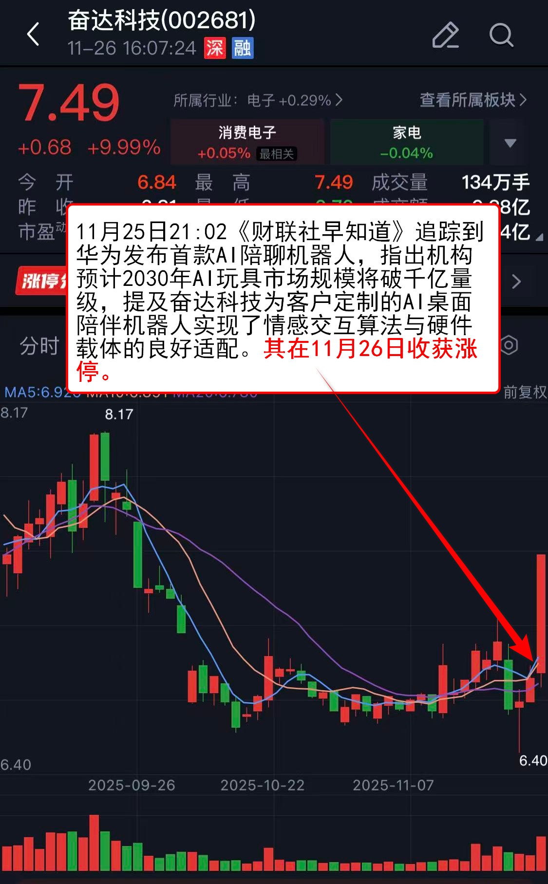 11月25日21:02《财联社早知道》追踪到华为发布首款AI陪聊机器人,指出机构预计2030年AI玩具市场规模将破千亿量级,提及奋达科技为客户定制的AI桌面陪伴机器人实现了情感交互算法与硬件载体的良好适配。其在11月26日收获涨停。