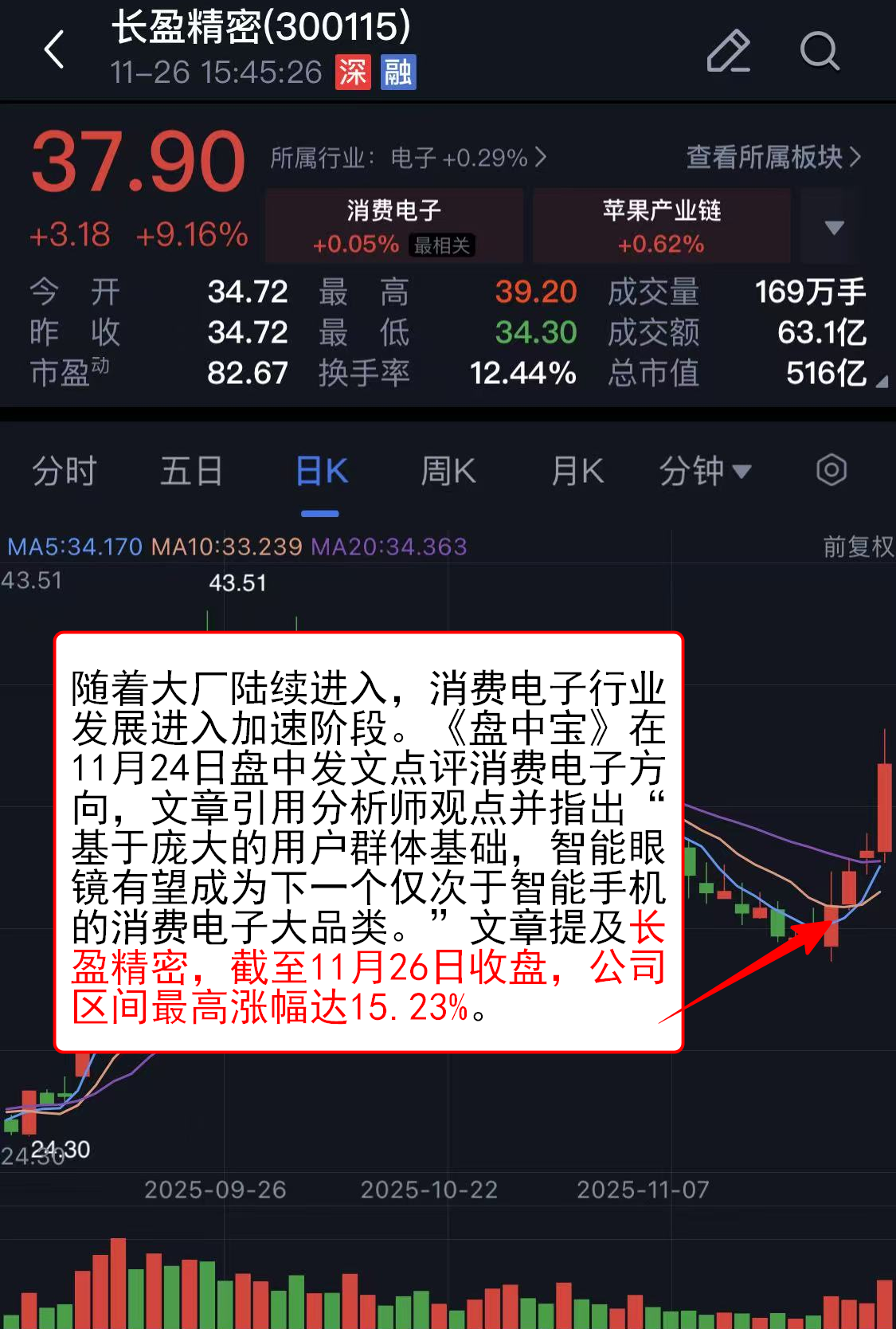 随着大厂陆续进入,消费电子行业发展进入加速阶段。《盘中宝》在11月24日盘中发文点评消费电子方向,文章引用分析师观点并指出“基于庞大的用户群体基础,智能眼镜有望成为下一个仅次于智能手机的消费电子大品类。”文章提及长盈精密,截至11月26日收盘,公司区间最高涨幅达15.23%。