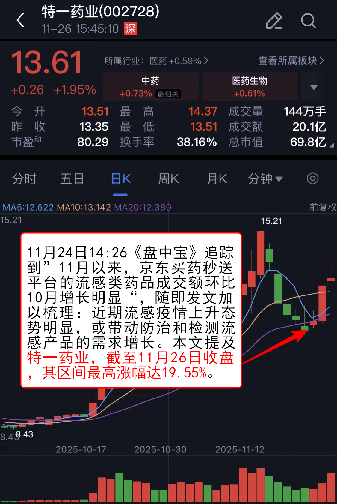 11月24日14:26《盘中宝》追踪到”11月以来,京东买药秒送平台的流感类药品成交额环比10月增长明显“,随即发文加以梳理:近期流感疫情上升态势明显,或带动防治和检测流感产品的需求增长。本文提及特一药业,截至11月26日,其区间最高涨幅达19.55%。