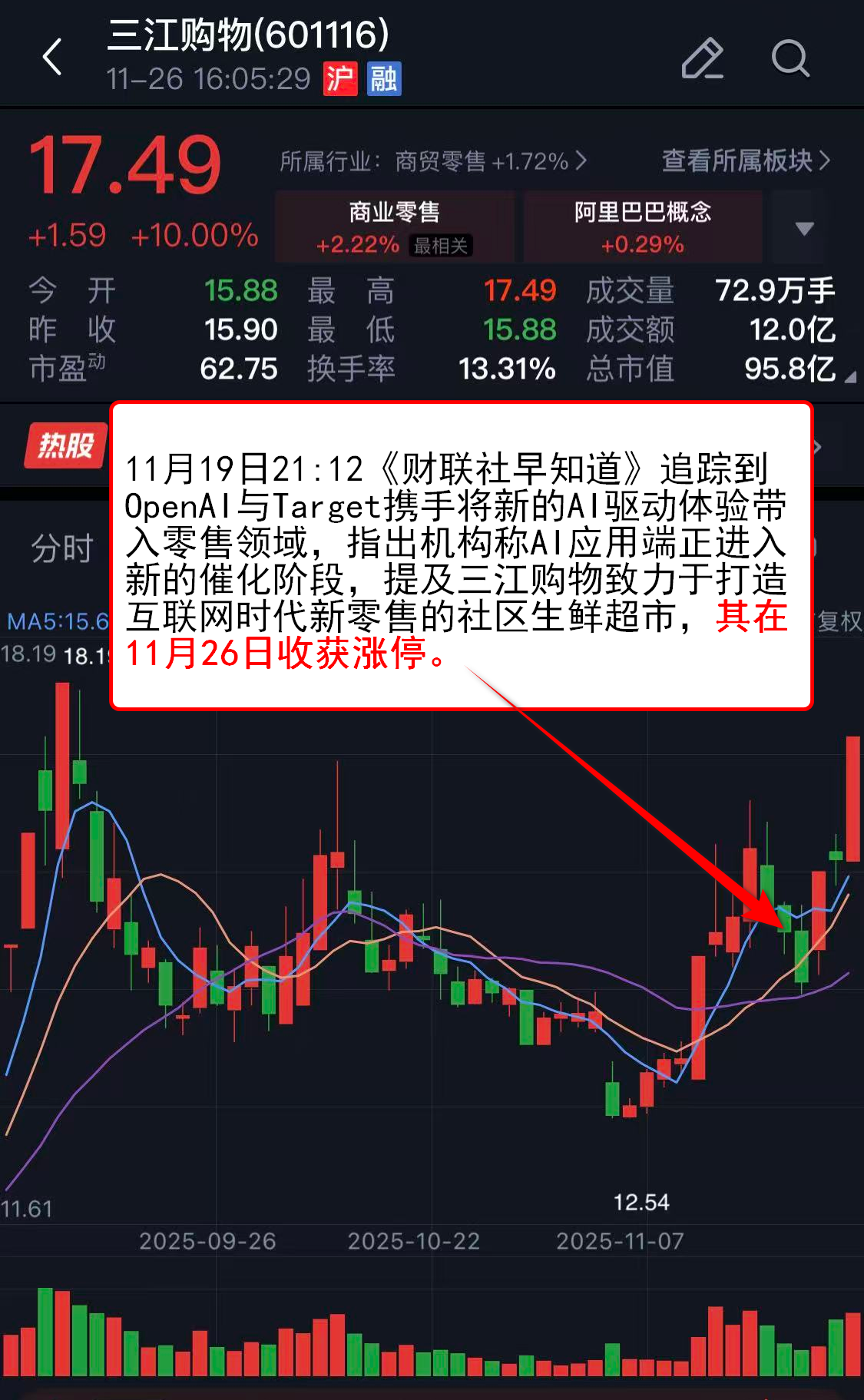 11月19日21:12《财联社早知道》追踪到OpenAI与Target携手将新的AI驱动体验带入零售领域,指出机构称AI应用端正进入新的催化阶段,提及三江购物致力于打造互联网时代新零售的社区生鲜超市,其在11月26日收获涨停。