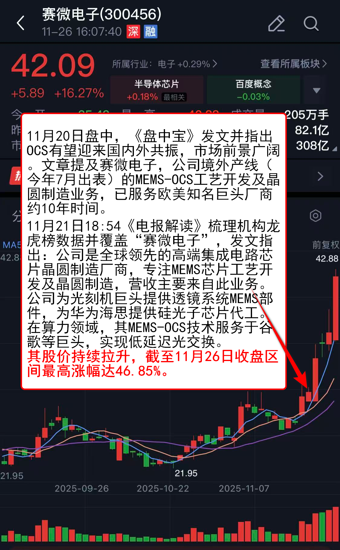 11月21日18:54《电报解读》梳理机构龙虎榜数据并覆盖“赛微电子”,发文指出:公司是全球领先的高端集成电路芯片晶圆制造厂商,专注MEMS芯片工艺开发及晶圆制造,营收主要来自此业务。公司为光刻机巨头提供透镜系统MEMS部件,为华为海思提供硅光子芯片代工。在算力领域,其MEMS-OCS技术服务于谷歌等巨头,实现低延迟光交换。