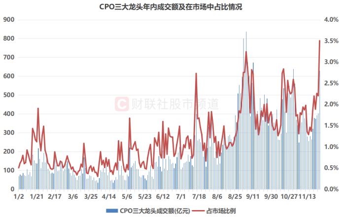 此外,若统计量能情况,CPO三大龙头——中际旭创、新易盛、天孚通信近日的资金活跃度再次升温。具体数据来看,其3股今日成交总额达630.07亿元,创10月30日以来近1个月新高。从占比数据上看,中际旭创、新易盛、天孚通信今日成交总额在整个A股市场中比例达3.51%,为今年第二次占比超3%,同时也录得年内最高纪录。