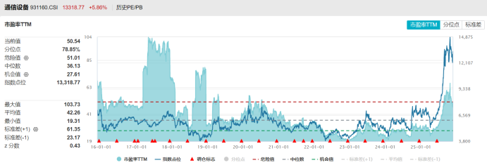 注:中证全指通信设备(通信设备)指数目前市盈率及分位点情况(截至11月26日收盘)