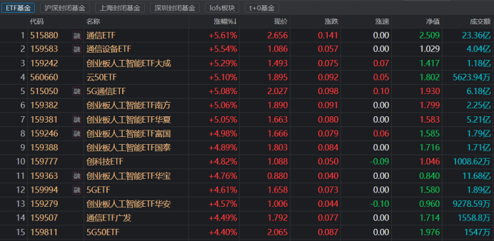 受CPO龙头股集体拉涨提振,通信系ETF今日也集体迎来修复行情。其中,基金规模超百亿的通信ETF(515880)大涨5.61%,在整个ETF市场中涨幅位居第一,其全天成交额达23.36亿元,为本月最高量能纪录。此外,创业板人工智能ETF因成分股中含有中际旭创、新易盛、天孚通信等CPO大盘权重今日也大幅走高,相关ETF基金涨幅多在4%以上。