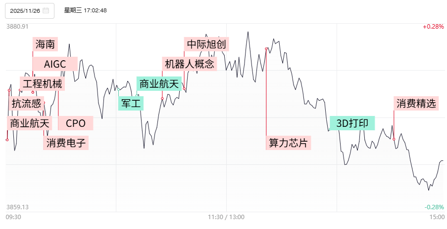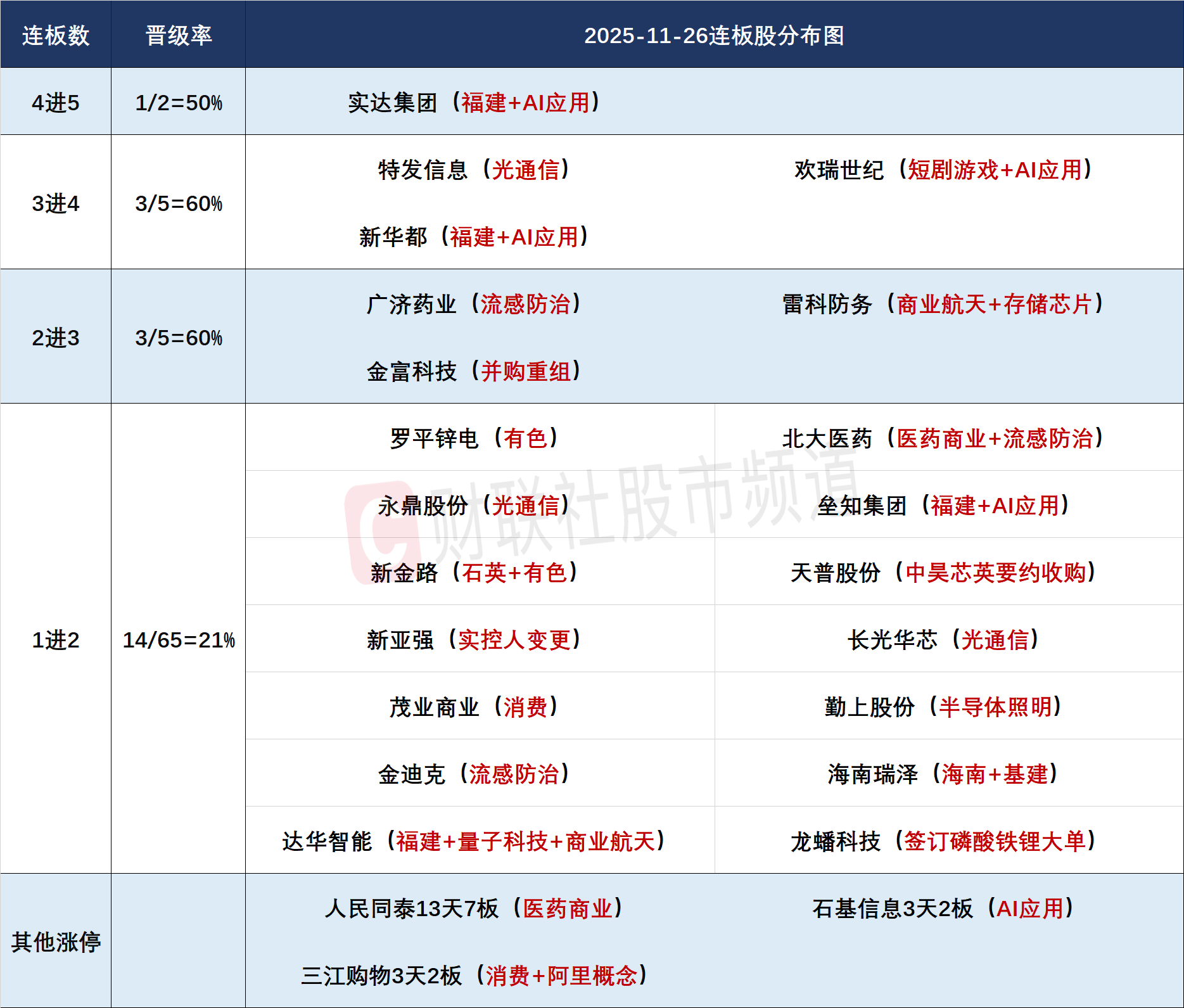 连板晋级率升至58.33%,连板高度仍维持5板,高位人气股整体分化态势依旧,昨日展开强修复的福建板块维持高人气,叠加AI应用的两只连板人气股实达集团、新华都均实现晋级,但昨日反包板的榕基软件遭遇跌停。而此前7连板的中水渔业遭遇2连跌停,航天发展触及跌停,拖累水产、军工两大板块双双退潮。此前同步走强的AI软硬件之间表现分化,资金重新转向算力硬件端权重大票,“易中天”三巨头盘中一度均涨超9%。消息面驱动主导的抗流感以及大消费板块的拉升并未有效接棒,整体仍以此前超跌后的技术面修正为主,短期AI产业链主导的修复行情的核心地位暂难撼动。