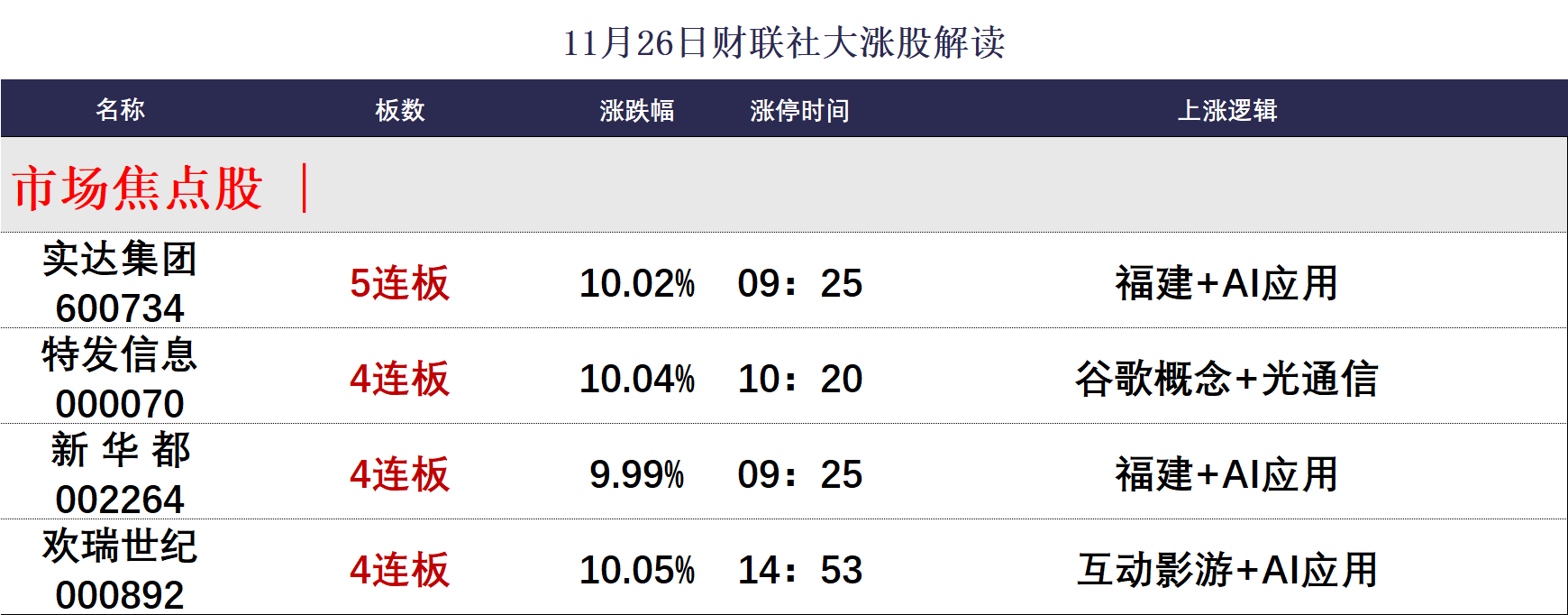 财联社11月26日讯,今日68股涨停,23股炸板,封板率为75%,实达集团5连板,欢瑞世纪、特发信息、新华都4连板,广济药业、雷科防务、金富科技3连板。深成指、创业板指双双低开高走,创业板指盘中一度涨超3%。沪深两市成交额1.78万亿,较上一个交易日缩量288亿。盘面上,市场热点快速轮动,全市场超3500只个股下跌。板块方面,医药、零售、CPO等板块涨幅居前,军工装备、林业、游戏等板块跌幅居前。截至收盘,沪指跌0.15%,深成指涨1.02%,创业板指涨2.14%。