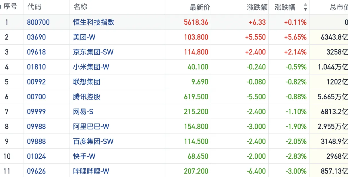 盘面上,今日科技股涨跌分化,快手跌近3%,百度跌2%,阿里巴巴跌1.9%,小米、腾讯飘绿,美团大涨5.6%表现最为强势,京东涨超2%。
