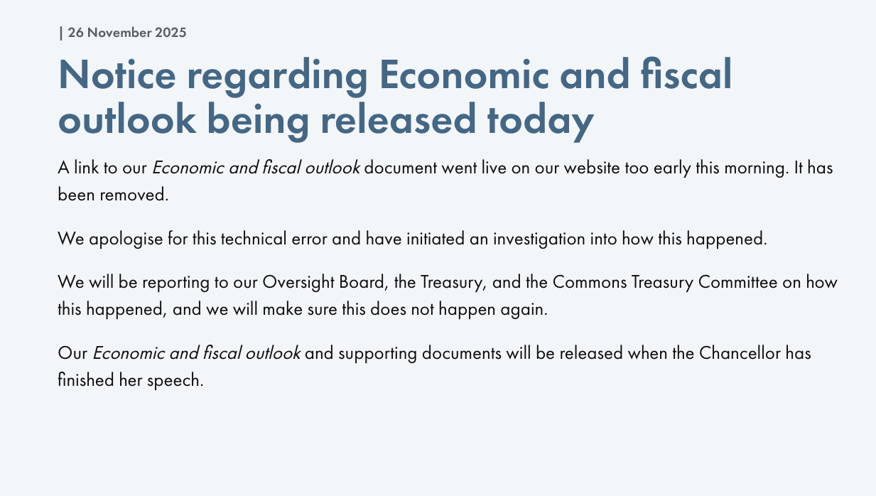 闯祸之后,OBR迅速道歉并暂时屏蔽网页链接。该机构表示:“今天早上指向最新《经济与财政展望》文件的链接过早上线…我们为此技术错误致歉,并已启动调查以查明事发原因。”
