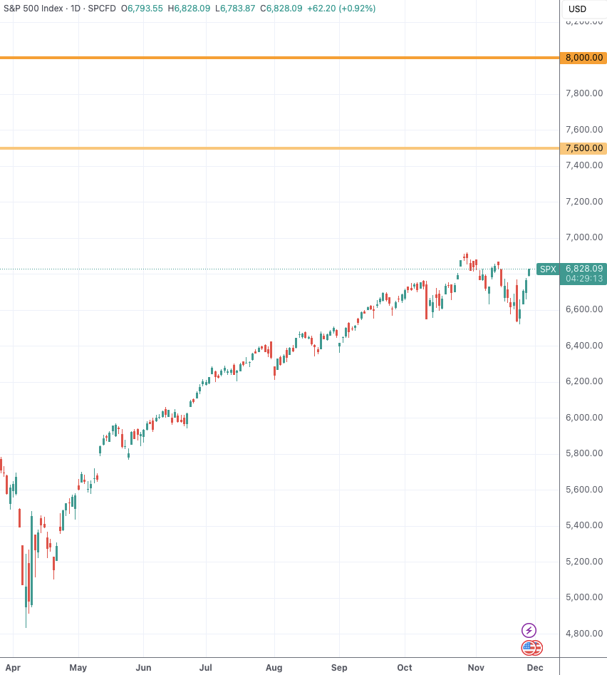 简单概述这份预测,杜布拉夫科团队给出的7500点基准目标基于“美联储降息两次后暂停行动”。策略师们也表示:“如果美联储进一步放松政策(因通胀形势改善),我们认为会有更大的上行空间,标普500指数将在2026年内突破8000点。”