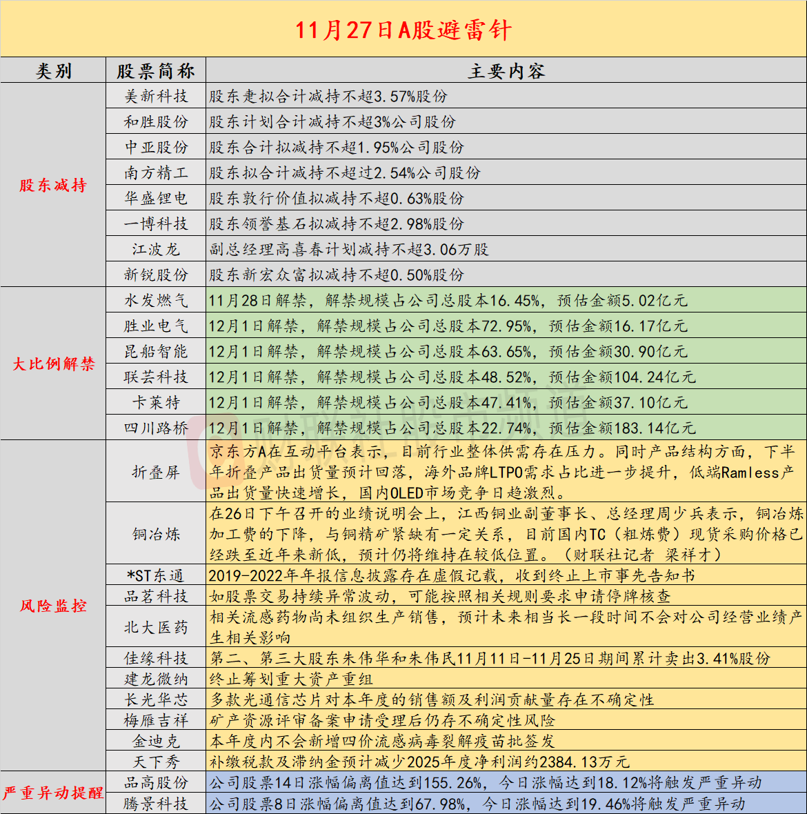 导读:财联社11月27日投资避雷针,近日,A股及海外市场潜在风险事件如下。国内经济信息方面包括:1)京东方A称,行业整体供需存在压力,下半年折叠产品出货量预计回落;2)江西铜业表示,国内粗炼费采购价格已经跌至近年来新低;公司方面重点关注包括:1)*ST东通2019-2022年年报信息披露存在虚假记载,收到终止上市事先告知书;2)品茗科技公告,如股票交易持续异常波动,可能按照相关规则要求申请停牌核查;海外市场重点关注包括:1)俄方称拒绝任何让步,乌方称不接受领土被占;2)美银表示,到2030年英伟达仍将主导市场,但市场份额可能从目前的85%降至75%。