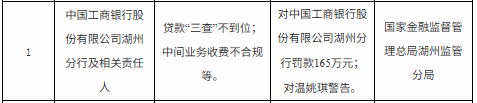 针对上述违法违规行为,国家金融监督管理总局对工商银行湖州分行罚款165万元;对温姚琪警告。