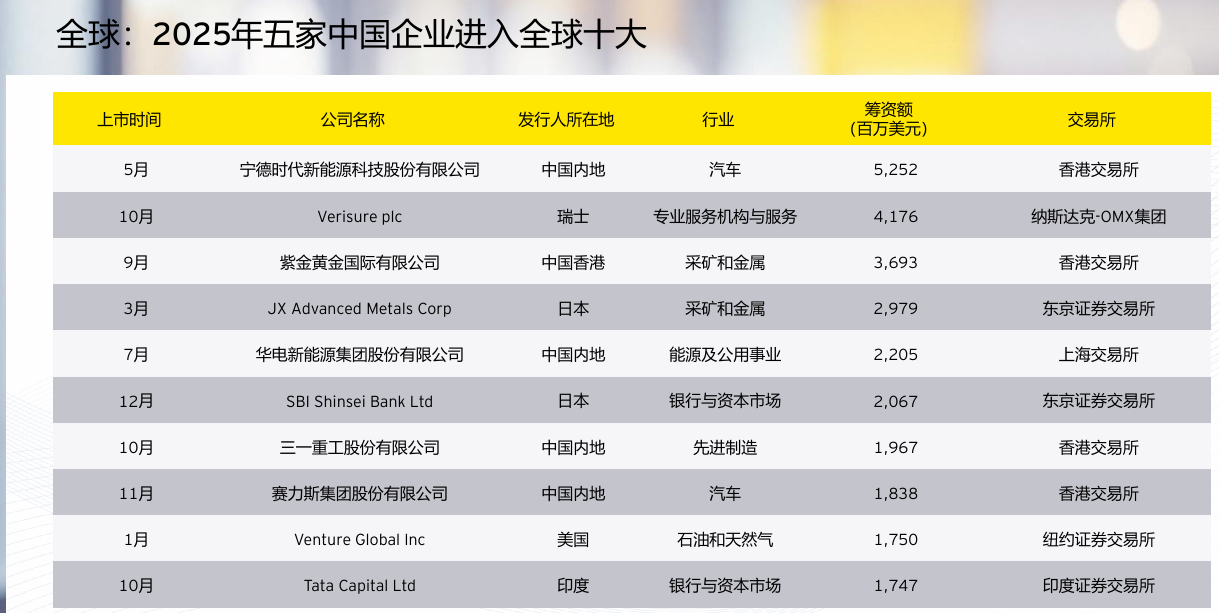 在中国大型企业纷纷登陆香港IPO市场的背景下,宁德时代、紫金国际、三一重工和赛力斯的港股IPO项目均跻身今年全球十大IPO项目,其中宁德时代香港IPO以410亿港元融资额稳居第一,之后三家公司融资额分别达287亿港元、154亿港元和143亿港元。而7月在上交所上市的华电新能源,以181.7亿元人民币,在全球十大IPO项目中排名第五。