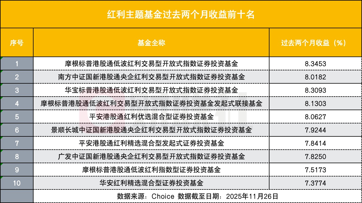 ②港股红利主题基金收益更为亮眼,多只相关产品过去两个月涨幅超8%。