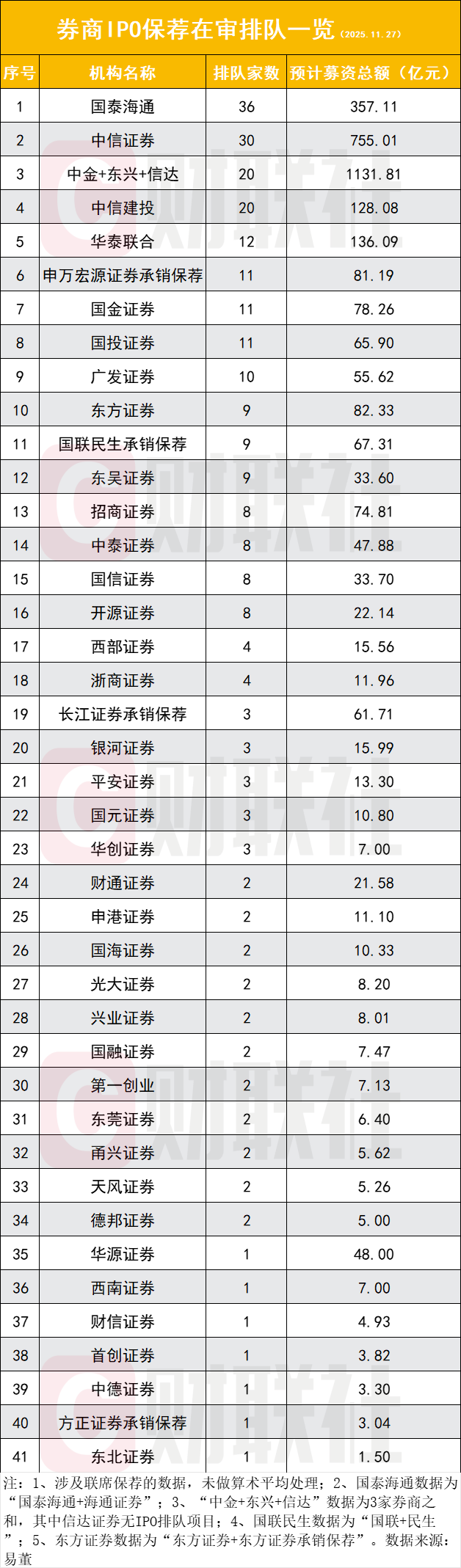 此外,有9家排队的券商是东方证券、国联民生承销保荐、东吴证券,有8家排队的券商是招商证券、中泰证券、国信证券、开源证券,有4家排队的券商是西部证券、浙商证券。