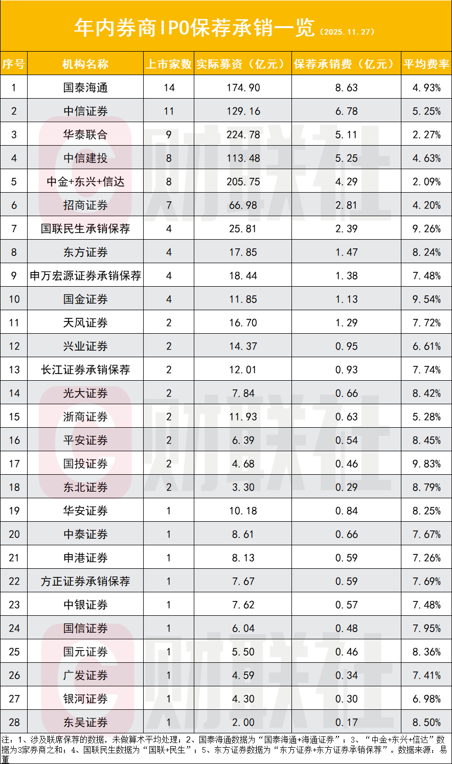 易董数据统计显示,IPO保荐承销上市数量排名前五的券商是国泰海通(14家)、中信证券(11家)、华泰联合(9家)、中信建投(8家)、以及筹划合并中的“中金+东兴+信达”(8家)。
