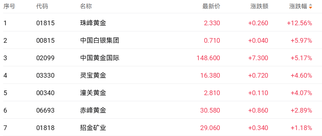 截至收盘,珠峰黄金(01815.HK)涨12.56%、中国黄金国际(02090.HK)涨5.17%、灵宝黄金(03330.HK)涨4.60%。