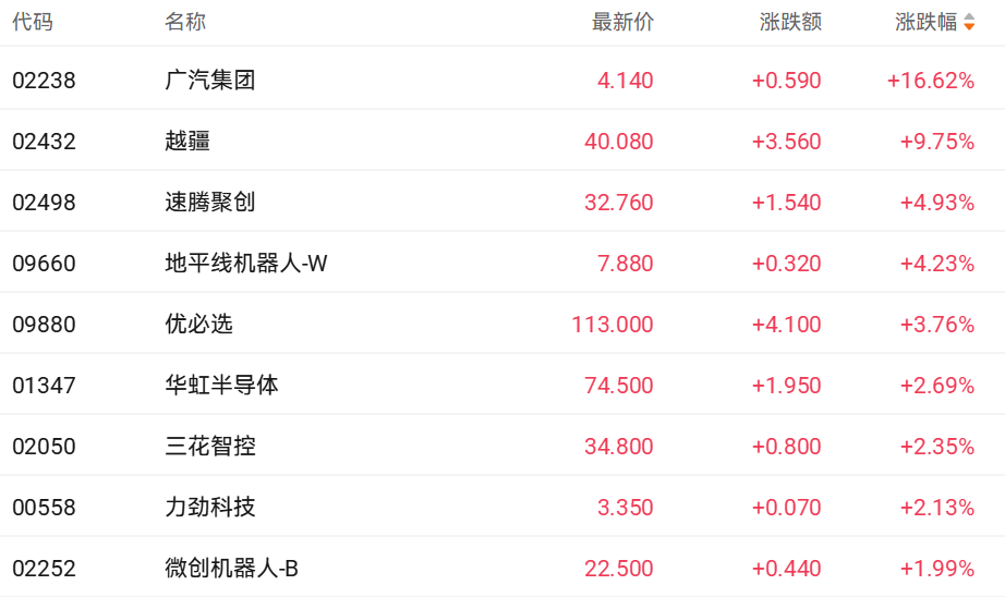 截至收盘,广汽集团(02238.HK)涨16.62%、越疆(02432.HK)涨9.75%、优必选(09880.HK)涨3.76%。
