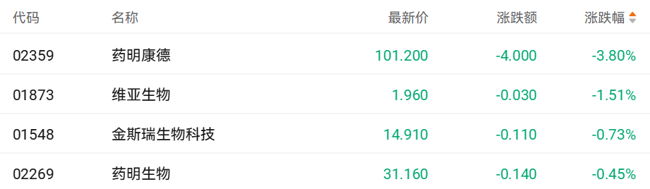 截至收盘,药明康德(02359.HK)跌3.80%、维亚生物(01873.HK)跌1.51%、药明生物(02269.HK)跌0.45%。