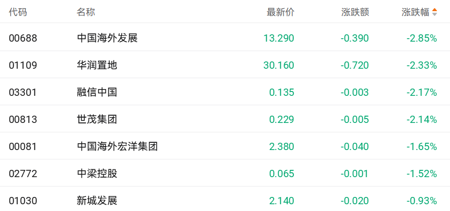 截至收盘,中国海外发展(00688.HK)跌2.85%、华润置地(01109.HK)跌2.33%、世茂集团(00813.HK)跌2.14%。