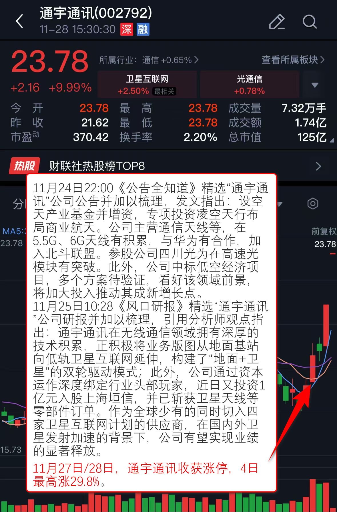 11月27日、28日,通宇通讯收获涨停,4日最高涨29.8%。