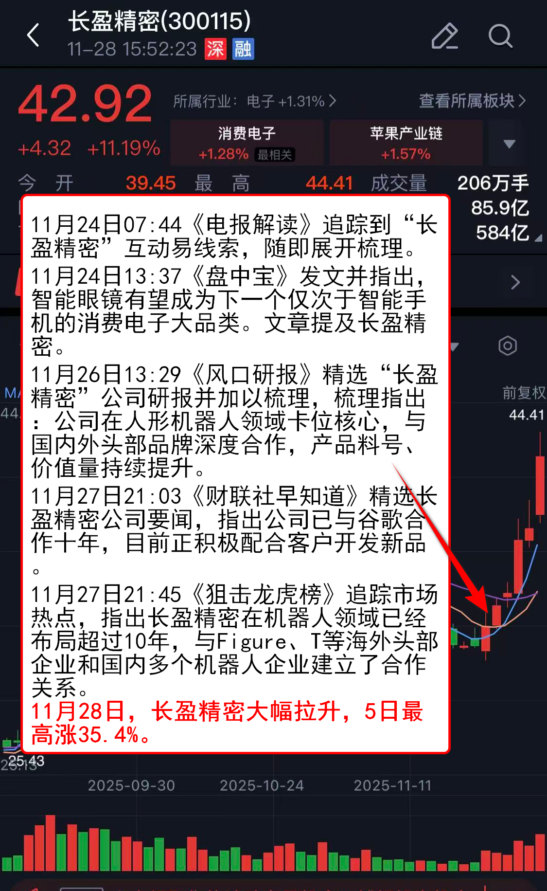 11月28日,长盈精密大幅拉升,5日最高涨35.4%。