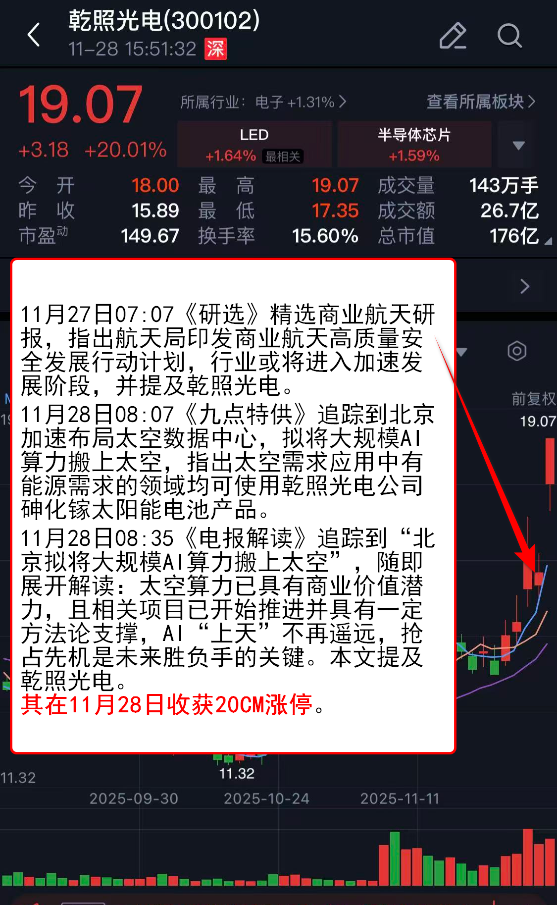 11月28日08:35《电报解读》追踪到“北京拟将大规模AI算力搬上太空”,随即展开解读:太空算力已具有商业价值潜力,且相关项目已开始推进并具有一定方法论支撑,AI“上天”不再遥远,抢占先机是未来胜负手的关键。本文提及乾照光电。