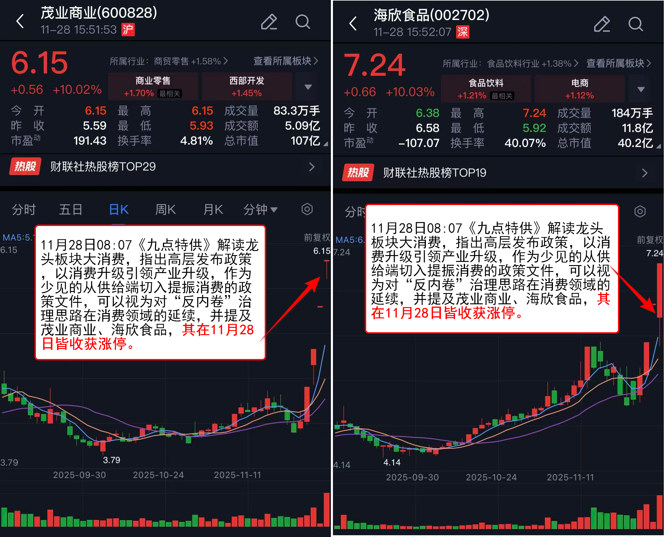 11月28日08:07《九点特供》解读龙头板块大消费,指出高层发布政策,以消费升级引领产业升级,作为少见的从供给端切入提振消费的政策文件,可以视为对“反内卷”治理思路在消费领域的延续,并提及茂业商业、海欣食品,其在11月28日皆收获涨停。