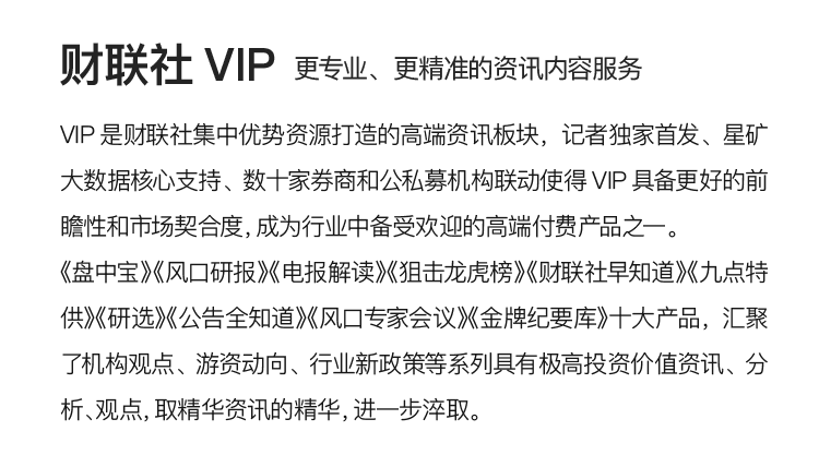 注:财联社VIP为内容资讯产品,并非投资建议。以下内容仅为资讯价值展示非对相关公司的推荐建议,非未来走势预测。投资有风险,入市需谨慎。