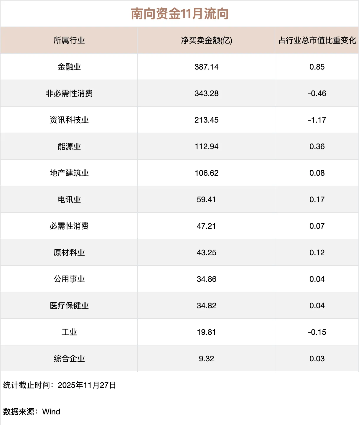 同时,消费股及科技股也更受青睐,非必选性消费行业11月获流入343.28亿港元,较上月多流入约190亿;而资讯科技业也获流入达213.45亿港元,约为上月流入金额的3倍。