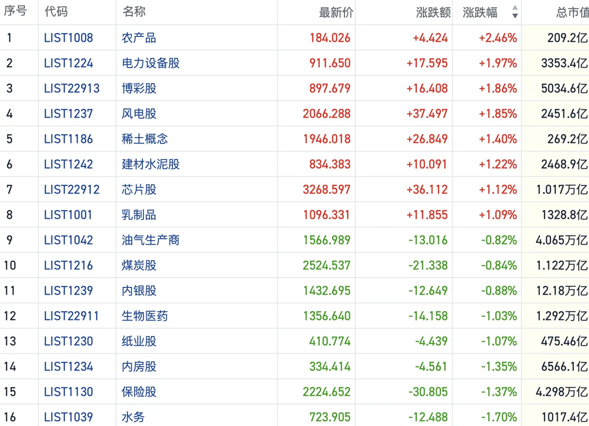 其他方向上,军工股再度活跃,风电、黄金、有色、博彩、锂电、建材水泥等周期类品种全线上行。