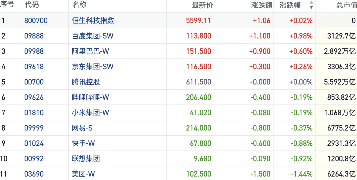 盘面上,今日大型科网股继续分化格局,其中,美团跌1.44%,快手、小米小幅走低,百度、阿里巴巴、京东飘红。