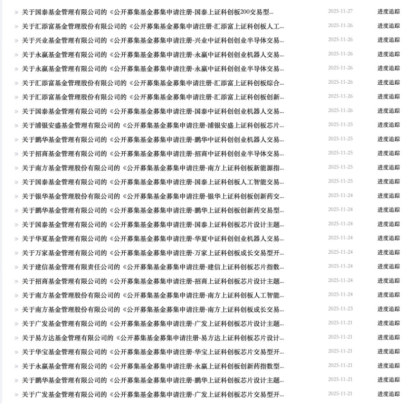 财联社不完全统计显示,自11月21日16只硬科技基金获批以来,短短5天之内,已有多达28只科创相关指数基金上报,覆盖双创人工智能、双创半导体、双创机器人、科创芯片、科创芯片设计、科创新能源、科创创新药细分垂直等领域。