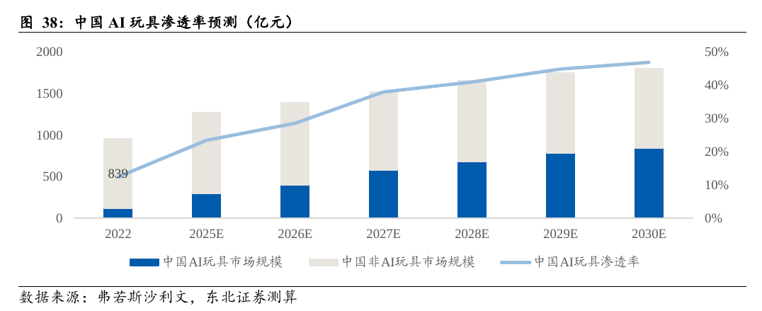 东北证券研报认为,AI玩具赋予了玩具“动”的能力,即交互、陪伴与教育(问答)三重能力,整体需求向全年龄段辐射,AI有望成为继潮流IP之后玩具市场的核心催化剂,潜力将远超潮玩爆发时期的Z世代。市场规模上,该研报指出,从中性角度判断,AI玩具渗透率提升速度至少达到潮流玩具玩的渗透速度,预计2026/2028/2030年国内渗透率有望达到29%/41%/47%,2030年国内市场有望接近850亿元。研报看好的相关公司包括IP+AI玩具制造商如高乐股份、奥飞娱乐、实丰文化。