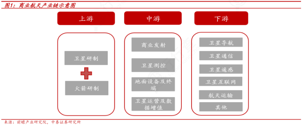 据介绍,商业航天是指以市场化方式提供航天产品和服务的产业,覆盖火箭发射、卫星应用和太空旅游等领域。产业链上游包括卫星与火箭研制;中游涉及商业发射、卫星测控、地面设备及终端、卫星运营与数据增值;下游则广泛应用于卫星导航、通信、遥感、互联网、航天运输等场景。