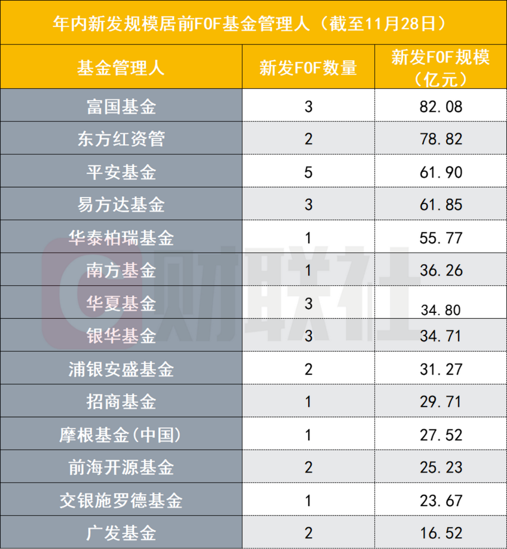 管理人的口径来看,2家旗下诞生了60亿规模级别FOF的基金管理人,也成为年内新成立规模最大的2家。富国基金以82.08亿元的新成立规模领先,新成立3只FOF产品。
