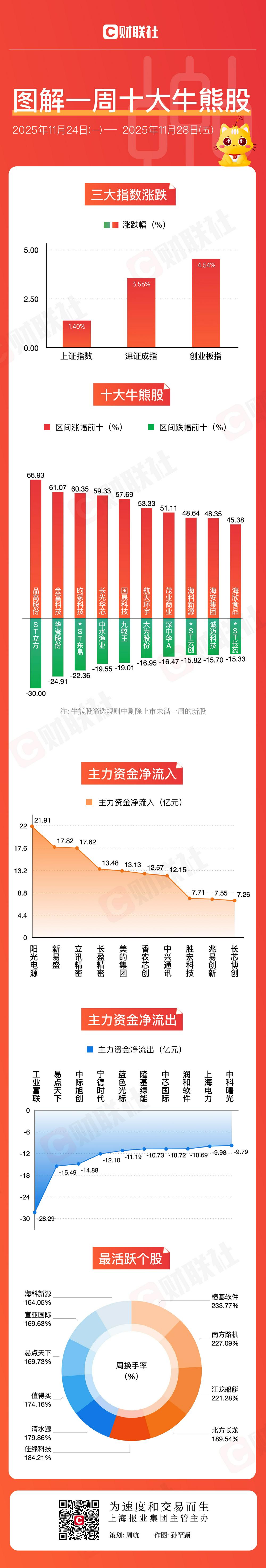 财联社11月30日讯,本周A股三大指数反弹拉升,其中上证指数周涨1.40%,深成指周涨3.56%,创业板指周涨4.54%。本周通信设备、教育、半导体、电池板块涨幅居前,CPO、铜缆高速连接、AI应用、商业航天概念股表现活跃。