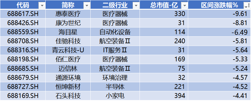 上表是本周跌幅榜前十公司,分别为:惠泰医疗、康为世纪、海目星、佳驰科技、青云科技-U、佰仁医疗、迈信林、通源环境、恒坤新材、石头科技。