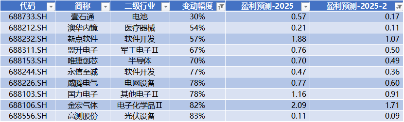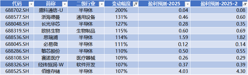 上表是本周盈利预测(规模净利润预测值)中值上调/下移的公司,其中上调有42家,本文选取其中幅度最大的前十家(若不足十家则按实际数量列示),分别为:盛科通信-U、浙海德曼、长光华芯、欧林生物、思瑞浦、必易微、敏芯股份、赛诺医疗、经纬恒润-W、佰维存储。