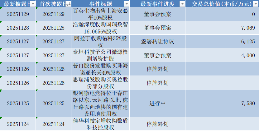 本周科创板并购最新进展共18条,其中属于本周首次披露的有8条:百英生物出售上海安必平10%股权、浩瀚深度收购国瑞数智16.0656%股权、阿拉丁收购佑科35%股权、泰坦科技子公司微源检测增资扩股、普冉股份发股购买珠海诺亚长天49%股权、思瑞浦发股购买奥拉股份部分股权、银河微电竞得位于春江路以东,云河路以北,虎丘路以西地块的国有建设用地使用权、佳华科技定增收购数盾科技控股权。