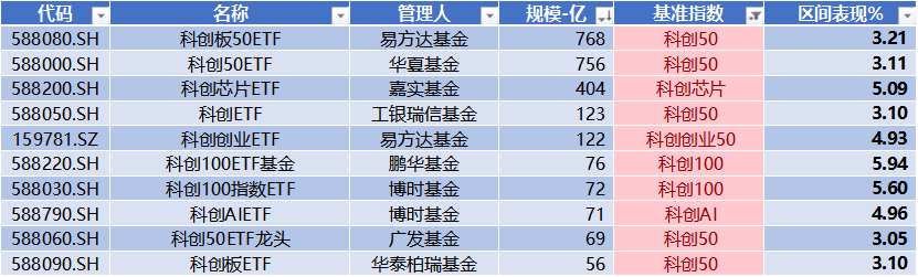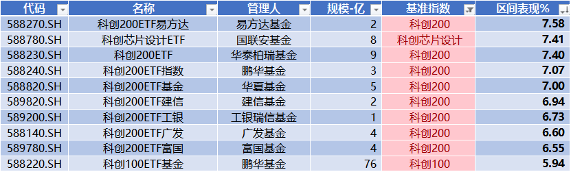 上表是本周市场表现按照降序排列的科创板ETF基金,本文选取前十名。本周科创板ETF中,芯片设计及科创200主题产品表现居前。