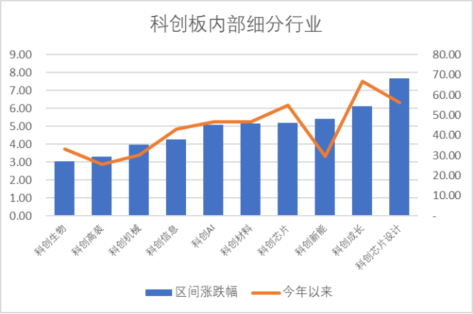 如上图所示,本周科创板内部呈现普涨,芯片设计板块一马当先,生物医药板块居末。