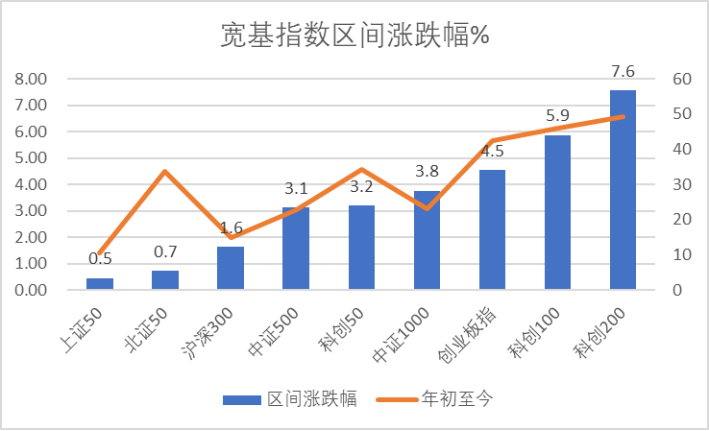 本周,A股主要宽基指数呈现普涨,科创系指数大多高于中位数,其中科创200、科创100、科创50分别涨:7.6%、5.9%、3.2%。