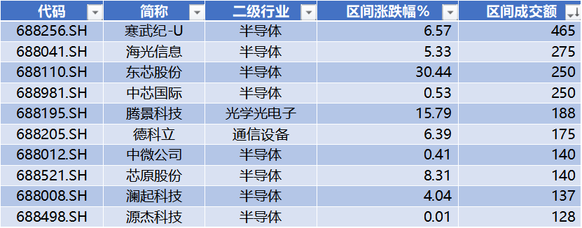 上表是本周成交额(亿)前十公司,分别为:寒武纪-U、海光信息、东芯股份、中芯国际、腾景科技、德科立、中微公司、芯原股份、澜起科技、源杰科技。