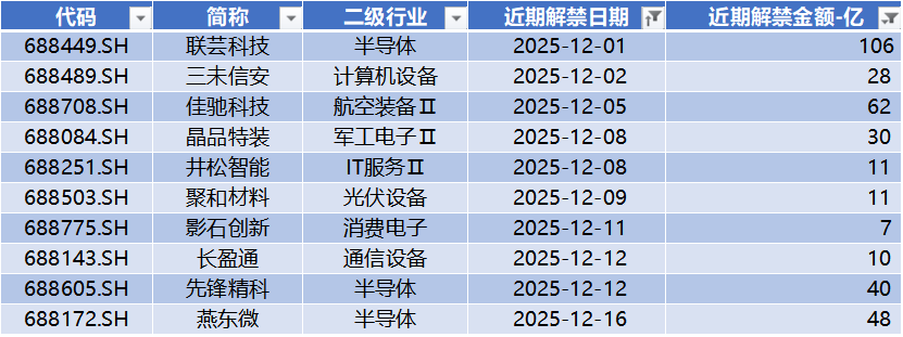 经过wind数据终端查询,近期有解禁的公司,本文剔除金额小于5亿的部分,然后按照时间顺序由近至远,选取前10家公司,分别为:联芸科技、三未信安、佳驰科技、晶品特装、井松智能、聚和材料、影石创新、长盈通、先锋精科、燕东微。